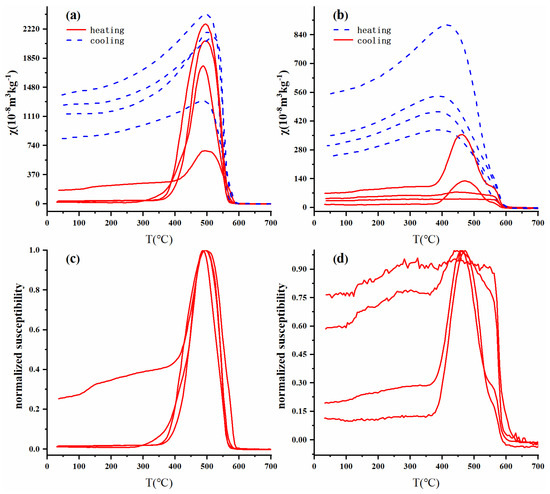 The magnetic components in representative samples can be identified according to the temperature dependence of magnetic susceptibility (χ-T curve) [30,31,32]. We normalized the curves obtained (Figure 4c,d). As shown in Figure 2, all the final values after cooling were higher than the initial values before heating. This indicates that new minerals may have been formed during heating.
