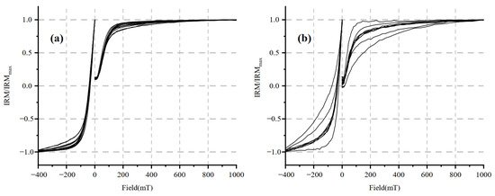 The IRM acquisition curves in the upper part of the sediment are more dispersed, while those in the lower part are more concentrated. The IRM acquisition curves for the high χ sample rise rapidly below 100 mT, reach 90% of the SIRM values at 200 mT and are close to the highest value but are not saturated in the range of 600–800 mT (Figure 5a). Most of the IRM acquisition curves for the low χ samples reached 80% of the SIRM values at 200 mT but were not saturated at 1000 mT (Figure 5b). These results indicate that the sediment is mainly composed of low-coercivity magnetite and maghemite. There are a few hard magnetic minerals that exist [38]. The maximum value of Bcr is 72.35 mT, the minimum value is 23.30 mT and the average value is 38.05 mT. The hysteresis loops of the samples also show similar characteristics.