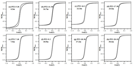 Typical magnetic hysteresis loops (after slope correction) for core PT2, with (a–d) low χ value samples and (e–h) high value samples.