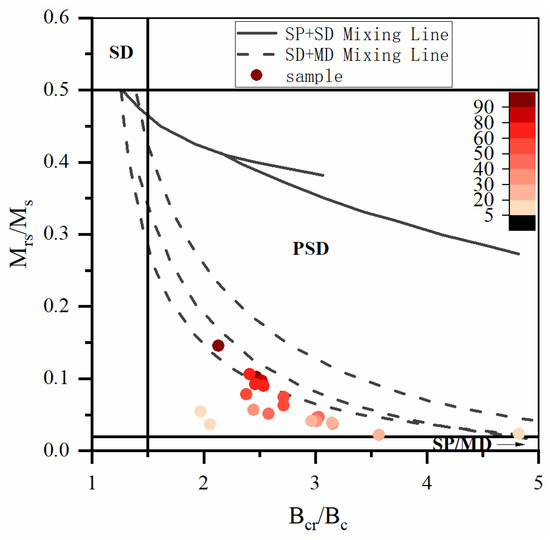 Hysteresis ratios plotted on a Day plot [41] for representative samples from the PT2 drill core. SD—single domain; PSD—pseudosingle domain; MD—multidomain; SP—superparamagnetic. The colour change in the colour bar corresponds to the magnetic susceptibility. The higher the magnetic susceptibility value is, the darker the sample point.
