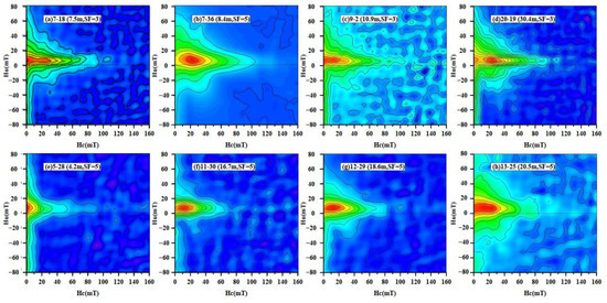 The Day plot diagram is plotted with Bcr/Bc and Mrs/Ms as horizontal and vertical coordinates [27]. It is used to reflect the particle size of ferrimagnetic minerals contained in the sample [18,41]. The Day plot diagram shows that the state of the magnetic domain of the selected samples is mostly the vortex state (the PSD range) [41,42]. The projection points of typical samples are approximately along the SD + MD mixing curve, and with decreasing χ, they extend to the direction of MD grains (Figure 7). However, determining the field state of the Day plot diagram is often fuzzy [43]. To better distinguish the magnetic domain state of ferrimagnetic minerals and understand the interaction between particles, the first-order reversal curve (FORC) is proposed [44,45,46]. The sample with high χ values has a Hu peak at approximately Hc = 20 mT, indicating the presence of SD particles (Figure 8a–d). The vertical distribution at less than 10 mT shows the information for the SP particles. In addition, the FORC diagram as a whole is more divergent, demonstrating strong PSD grain characteristics [44]. The distribution of the unclosed peripheral curve on the Hu axis shows the characteristics of the MD grains. However, in the samples with lower susceptibility (Figure 8e–h), there is a larger domain change. The difference is that the curves for low χ samples have a weak distribution along the Hu axis. Some samples show obvious SD and/or SP grain information, and some samples are similar to the curves for high χ value samples.