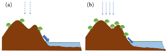 The process of magnetic mineral input in dry and humid climates, where (a) is dry and (b) is humid. The blue dotted arrows represent rainfall. The solid blue arrows represent the direction of water flow.