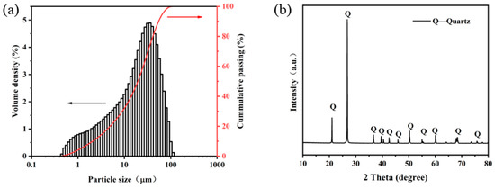 (a) Particle Size Distribution (PSD); (b) XRD pattern of quartz sample.
