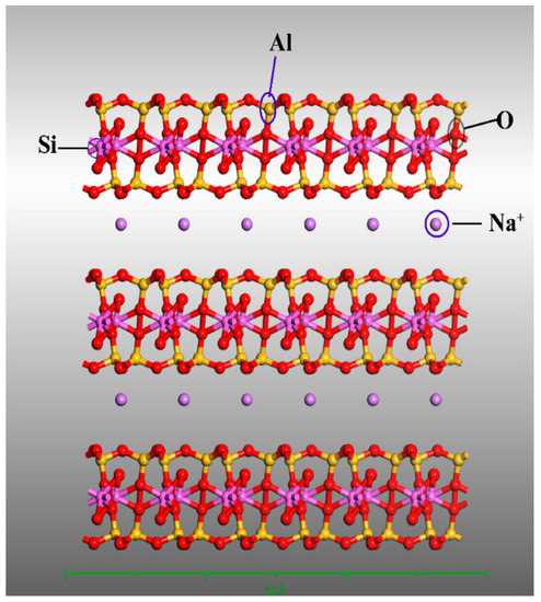 Montmorillonite (MMT) is a nanolayered phyllosilicate mineral that consists of two O-Si-O tetrahedral sheets sandwiching one O-Al(Mg)-O octahedral sheet, as shown in Figure 3. Isomorphic substitutions always exist. For example, Si4+ in the tetrahedral sheet can be replaced by Al3+; Al3+ in the octahedral sheet can be replaced by Mg2+ [17]. Due to such an isomorphous substitution, the MMT nanolayer exhibits inherent negative charges, which can be compensated for by cations (Na+, Ca2+) in the interlayer space [18,19]. It is noted that these negative charges are permanent, differing from carboxylic acid which cannot be dissociated below its pKa. In particular, the van der Waals force and electrostatic force holding the MMT nanolayers together can be overcome by certain methods. For example, MMT particles disassembled in aqueous dispersion, leading to reduced particle size. Ultimately, the fine MMT particles can be exfoliated to an individual nanolayer [20]. Figure 4a shows the PSD of the MMT sample. It was found that the water dispersed sample had a D90 of 4.521 μm and D50 of 0.842 μm, indicating the presence of single or multiple nanolayers. Larger particles may be attributed to MMT aggregates or the presence of impurities, including quartz and albite. As shown in the XRD pattern in Figure 4b, the MMT sample had a d(001)-spacing of 14.579 Å (2θ = 6.057°), which is a mixture of Ca2+ -MMT and Na+ -MMT [21]. The MMT slurry was stirred for at least 12 h prior to use for ample hydration and exfoliation.