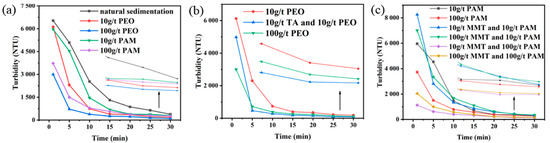 Supernatant turbidity of 10 wt.% -200-mesh quartz slurry during a 30-min sedimentation: (a) high molecule flocculants; (b) PEO and cofactor; (c) PAM and cofactor.