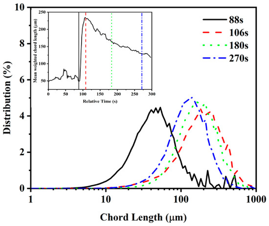 The FBRM data was processed and analyzed using Version 4.4 acquisition software. It was continuously scanned with a 2 s duration over the full range of chord lengths (1 to 4000 μm). Chord Lengths Distributions are expressed as line graphs for simplicity. Both unweighted and square-weighted chord lengths were acquired using the software. The unweighted chord length distribution is number-sensitive, providing an implication for the fine particles that are suspended in the slurry. Square-weighted chord length distribution represents the volumetric and mass contribution of the large flocs in the slurry.