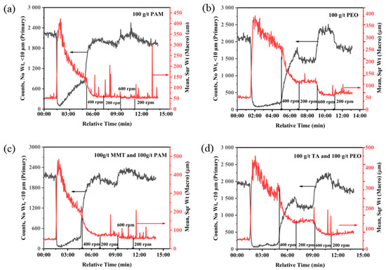 Applying a cycled shear scheme as shown in Figure 9 is a good tactic to study the floc strength and floc reversibility under different turbulent conditions [26,27]. The above results indicate that only fine flocs can be partially reflocculated after breakage. In order to calculate the MPS decrease slope and CFP increase slope at higher shear strength, FBRM test work was conducted for freshly prepared quartz slurry at a constant stirring speed of 400 rpm, and the results are shown in Figure 10. The corresponding slopes in Table 2 further indicate that PEO and its combination with TA outperformed PAM and PAM-MMT, in terms of floc strength. However, it is better to avoid either intense turbulent condition or long reaction time. Judicious feed well optimization allows aggregate growth to take place under the milder shear experienced immediately below the feed well exit. The implementation of the FBRM online particle size measurement allows design options or flocculant addition points to be identified that produce the optimal residence time and flocculation response [28,29].