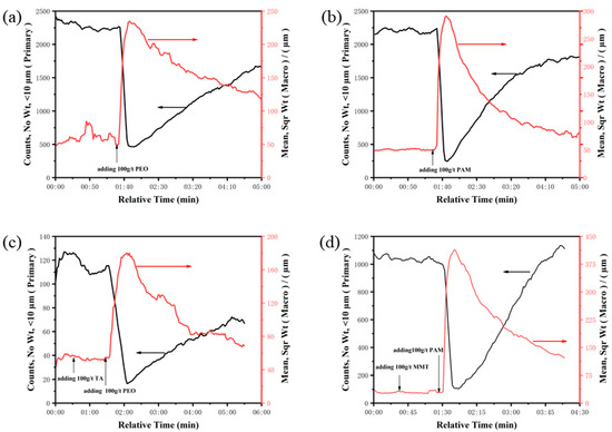Figure 9 demonstrates the FBRM results of different flocculants/cofactors systems that used quartz flocculation at a stirring speed of 200 rpm. The cofactors (TA/MMT) were added 60 s prior to flocculant (PEO/PAM) additions, and all reagents were used at a dosage of 100 g/t. As can be seen, the particle size did not change in the period from 0 s to 90 s, indicating that cofactors alone were incapable of flocculating quartz particles without the presence of high molecule weight flocculants.