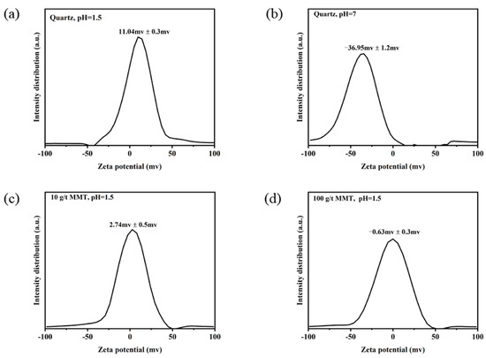 The zeta potential of quartz suspension: (a) pH1.5; (b) pH7; (c) pH1.5 with 10g/t MMT; (d) pH1.5 with 100g/t MMT.