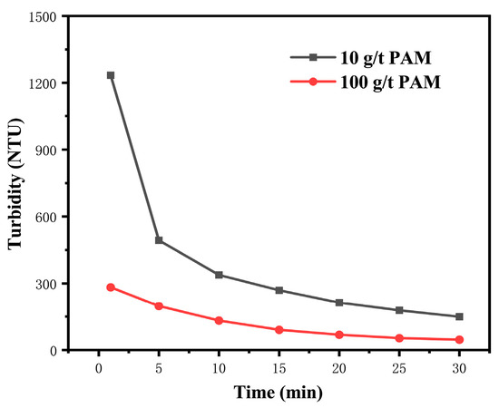 The settling behaviors of quartz slurry were investigated to examine the flocculation efficiency of the proposed polymers–cofactors system. The supernatant turbidity of 10 wt.% -200-mesh quartz slurry during sedimentation is shown in Figure 6. These sedimentation curves can be described using the exponential decay of turbidity as a function of time. The use of PEO at a dosage of 10~100 g/t settles significantly faster, with 10-min turbidity reduced to 94.4 NTU (100 g/t), compared to 834 NTU (100 g/t) at the same dose of PAM. Low turbidity indicated a better clarity of the supernatant, containing a smaller number of suspended particles. In the simulated acidic leaching pulp, PEO was proved to be more efficient to flocculate quartz particles. On the other hand, PAM might be good at accelerating settling rate, but it was not capable of controlling the turbidity of the supernatant, even with an excessive dosage.