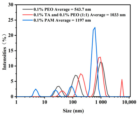 The synergistic function of the PEO-TA system can be different from that of the PAM-MMT system. The PEO itself behaved better than the PAM because of the stronger hydrogen binding of PEO’s ether oxygen with the silanol-bearing surface [31,32,33]. The PAM has a higher molecule weight than the PEO, possibly associated with higher viscosity. In this work, adsorption is a more determining factor, compared to molecule weight, in the process of fine silica particle flocculation. The TA had a negligible affinity for quartz, and in such circumstances, previous research has proven that TA barely adsorbed on quartz [27]. It was proposed in the literature that TA interacted with PEO to form associative polymer complexes which then adsorbed onto a mineral surface through PEO [15,16]. Polymeric flocculant dissolved in aqueous solution has a measurable particle size due to molecule structure conformation. Figure 13 shows the molecule size of flocculants measured by dynamic light scattering. It is seen that the formed PEO-TA complexes were larger in size compared to PEO alone, and such a complex structure was more efficient to increase the floc size. In addition, the PEO-TA complexes were comparable with PAM in size, indicating that the formed complexes might have a molecule weight of around 10~12 millions.