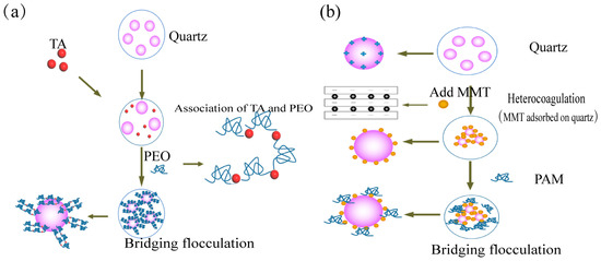 Schematic illustration of flocculation: (a) Quartz-TA-PEO; (b) Quartz-MMT-PAM.