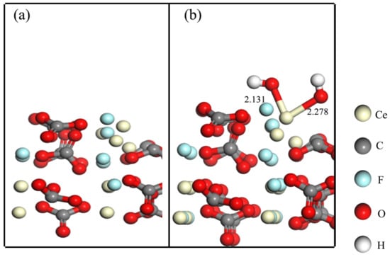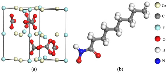 The crystal structure of bastnaesite was obtained from the Materials Project database, and the unit cell is shown in Figure 1a. The presence of NHA in the flotation caused a solution of NHA ions. Therefore, the NHA ion model was constructed in the simulation calculation of this paper (Figure 1b). Bastnaesite (CeCO3F) crystallizes in the hexagonal space group P-62c, and the unit cell parameters are a = b = 0.716 nm, c = 0.986 nm, α = β = 90°, and γ = 120°. The computational model includes three bastnaesite molecules. As shown, the crystal structure contains layers alternating between carbonate anions and Ce and F ions; the coordination number of Ce is nine, and the Ce ion coordinates with three F anions in the Ce—F layer and six O anions in the CO3F layer. In previous studies, surface energy was calculated for the different surfaces of bastnaesite so that the lowest energy (100) surface was used as the main cleavage surface. Figure 2 shows the bastnaesite (100) surface hydroxylation. According to the literature research, in alkaline solutions, the surface of bastnaesite is dihydroxylated [25]. Moreover, according to the principle of minimum energy, the dihydroxylation of the surface of bastnaesite is more stable than the monohydroxylation. Therefore, we constructed and optimized the dihydroxylated structure on the surface of bastnaesite as the surface to be adsorbed.