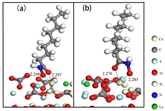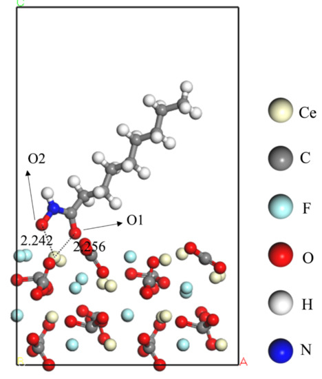As shown in Figure 3, NHA is adsorbed via the formation of a chelate structure with Ce on the (100) surface, as reported previously [35]. The calculated adsorption energy between NHA and the bastnaesite (100) surface was −536.370 kJ/mol. According to the calculation of the adsorption sites of the NHA bastnaesite (100) surface, it was found that the adsorption sites of the Ce atom on the boundary of the crystal plane are not as stable as the Ce atomic sites in the middle.