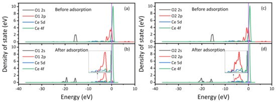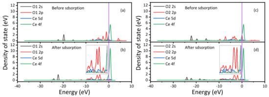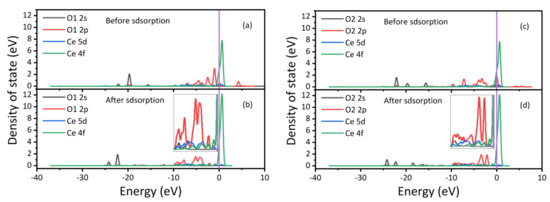 Next, the partial density of states (PDOS) was calculated based on the O 2s22p4 and Ce 4f15d1 valence electron configurations. The PDOS for the five-membered chelate structure on the bastnaesite (100) surface is shown in Figure 4. As shown in Figure 4a,b, the main DOS peaks near the Fermi level are the O 2p and Ce 5d orbitals, indicating that the reactivity of the O 2p orbital before adsorption is high. Figure 4c,d show that after the adsorption of NHA, the conduction band (−10 to 0 eV) mainly comprises the O 2p and Ce 5d orbitals. In particular, the DOS of the O 2p orbital shows significant changes: the peak narrows and shifts toward a higher energy. In addition, the degree of delocalization increases. Between −10 and 0 eV, the DOS of the O 2p and Ce 5d orbitals shows changes characteristic of the formation of bonds. Combined with the calculated charges listed in Table 2 and the Mulliken populations, in the monodentate adsorption model, O2—Ce1 transfers more charge during bond formation than O1—Ce1. Notably, the higher the degree of electron transfer, the stronger is the interaction.
