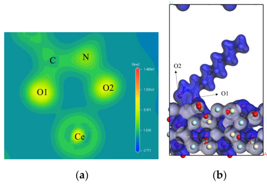 In addition, bond formation can be identified using a charge density plot, as shown in Figure 5a. In the figure, an increased charge density is denoted by a change in color from blue to red (Figure 5). As shown in the figure, there is a distinct increase in the charge density between O and Ce, but the electron distribution between O2 and Ce is significantly higher than that of O1—Ce1, suggesting the formation of a covalent bond between O2 and Ce1. Again, this may be a result of the lone-pair electrons on O2. This result is consistent with the results of the population analysis of the key atoms. In Figure 5b, it can be seen that the adsorbed electrons of NHA adsorbed on the bastnaesite (100) surface are mainly distributed on the CO3 group and collector, and there is also an obvious electron distribution between the O atom on NHA and the Ce atom on the surface of bastnaesite.