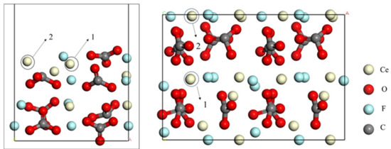 Atomic substitution usually occurs at the outermost layer of the cleavage surface, while it is more difficult at the inner layer. Figure 6 shows that there are four Ce atoms in the outermost layer of the bastnaesite (100) surface, but only two asymmetric Ce atoms. Studies on La doping mainly focus on these two asymmetric Ce atoms. The Mulliken populations of Ce1 after the introduction of La are listed in Table 3. As shown, the Ce atom has an increase in 5d electrons, and a decrease in 6s, 5p, and 4f electrons. The orbital electrons of Ce atom on the defect surface at position 1 and position 2 decrease by 0.05 e and 0.24 e, respectively.