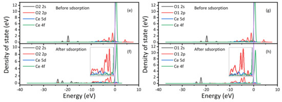 Next, we carried out the Mulliken population analysis of the Al(OH)3(s) adsorbed structure using the monodentate adsorption model; the results are listed in Table 7. The charge transfer to adsorbed Al(OH)3(s) is greater than that to NHA. As shown in the density of states plots in Figure 11, when Al(OH)3(s) is adsorbed, the O 2p orbital moves to higher energies. In addition, the Ce 4f peak increases in intensity and becomes sharp near the Fermi level, indicating a loss of electrons.