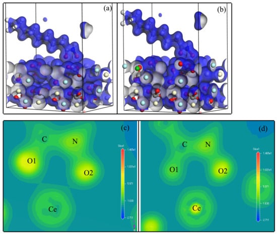 (a,b) are the charge density isoplanes adsorbed by NHA on the defective bastnaesite (100) surface; (c,d) are the charge densities between O—Ce atoms. (a,c) are the La atoms replacing Ce atoms at position 1, (b,d) are the La atoms replacing Ce atoms at position 2.
