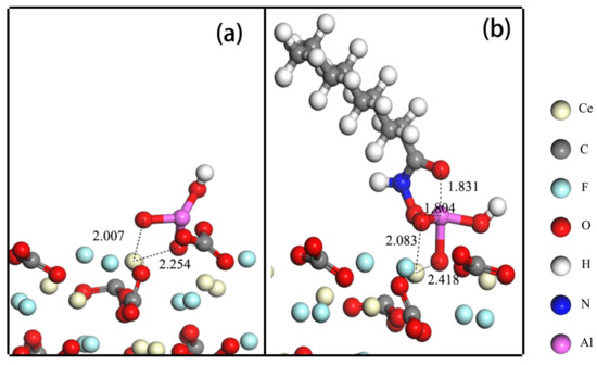 As shown in the adsorption model in Figure 10, both Al(OH)3(s) and NHA form chelate structures through oxygen atoms [20]. In Figure 10b, an adsorption model involving Al(OH)3 and NHA is shown. Here, Al(OH)3(s) interacts with the Ce atom on the (100) surface, and NHA interacts with Al. As shown, the bond lengths between Al and the oxygen atoms in NHA are 1.831 and 1.804 Å, respectively. The adsorption energy of NHA- on the surface of bastnaesite coated with Al(OH)3(s) is −604.972 kJ/mol, significantly higher than that of NHA on pristine bastnaesite. Because the Al atom radius is smaller than the Ce atom, the NHA adsorbed Al atom bond is more stable. Thus, NHA was preferentially adsorbed on the Al atoms. Accordingly, in the presence of Al(OH)3(s), the adsorption of NHA on Ce sites is inhibited.