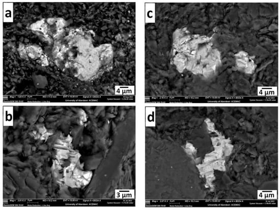 The irregular shape of the fluorocarbonate indicates that it is in a diagenetic phase, and fluorocarbonate minerals in sedimentary rocks are considered to be authigenic rather than detrital grains []. The crystal size is comparable with many published examples. Growth during diagenesis is consistent with the deposition of fluorite cement in the interbedded sandstones. The accompanying diagenetic mineralogy of pyrite framboids and calcite implies that the environment was anoxic and alkaline []. These characteristics help to show how fluorocarbonate mineralization occurred at Rhynie.