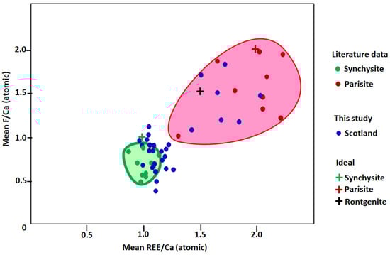The most widespread fluorocarbonate minerals in the Rhynie occurrence are synchysite Ca(REE)(CO3)2F and parisite Ca(REE)2(CO3)3F2. In both synchysite and parisite, the F/Ca atomic ratios commonly fall below the ideal stoichiometric values, i.e., below 1 and 2, respectively. This is mostly a consequence of hydroxyl (-OH) substitution for fluoride (-F), which can occur up to several 10 s % (e.g., [,,]). Thus, in several deposits, mean F/Ca ratios for synchysite are in the range of 0.5 to 0.6 [,,]. The median value determined for the fluorocarbonate phase at Rhynie is 0.85 (n = 41), which is consistent with synchysite rather than parisite. Similarly, the median REE/Ca atomic ratio of the Rhynie phase is 1.10 (n = 41), which is comparable with values for other synchysite occurrences. The data that show a plot between synchysite and parisite indicate that some grains may not be synchysite. We omit the intermediate rontgenite (rongtenite, röngtenite), as it is not universally used (Figure 6). Other case studies report fine intermixtures of synchysite and parisite [,,], which would explain the range of the Rhynie data. Synchysite occurs as Ce-, La-, Nd-, and Y-rich forms, and it is Ce-rich in this case. Many of the compositions may therefore be attributed to synchysite-(Ce) []. The profile of REEs (Ce > La > Nd >> others) is similar to many other occurrences of synchysite. It is also similar to the profile of REEs in typical monazite [,], which is consistent with a source for the fluorocarbonate REEs by the alteration of monazite. The apparent non-stoichiometry at the SEM scale is also explainable in terms of nanoscale disorder, or possibly unnamed phases [,]. There are also OH-dominant members of the series, e.g., hydroxylbastnäsite-(Ce), which would influence the stoichiometry if present.