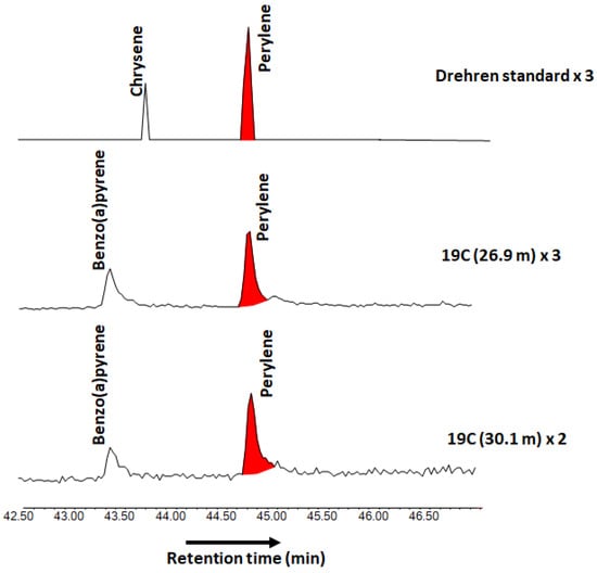 Mass spectra (m/z 252) for two samples of shale from core 19C, showing distinctive peak for perylene (red), indicating fungal activity. Peak identified using Drehren standard (Dr. Ehrenstorfer deuterated internal standard).