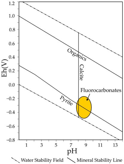 The precipitation of fluorocarbonates further required an alkaline environment, which is evidenced by the carbonate laminae and calcite cement. Limited stable isotope data for the carbonates (sampling points in Figure 2) implies an early diagenetic origin []. The combination of calcite, organic matter, and pyrite constrains the conditions of the peat-like environment [] to a limited Eh–pH space (Figure 8) that is appropriate for fluorocarbonate deposition [].