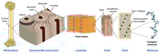 The hierarchical structure of bone from the histological to the molecular level. The structural protein collagen I, shown at far right, forms the majority of the soft-tissue matrix of bone tissue. Modified from Zimmerman et al. [30] under a CC BY-4.0 license.