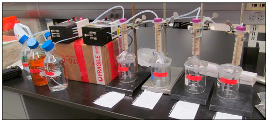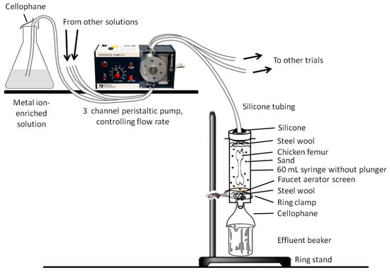 Our trial apparatus design (Figure 2) was inspired by that of Daniel and Chin [39] (which was in-turn inspired by [38]). Nitrile gloves were worn during the construction of each identical apparatus to limit the input of exogenous microbes and/or other contaminants. 60 mL polypropylene syringes (with plungers removed) were utilized as a sterile incubation chamber for each trial. To ensure sand would not pass through the base of the syringes, a small tuft of autoclave-sterilized steel wool was placed in the bottom of each syringe, then covered by an autoclaved faucet aerator (i.e., a fine stainless-steel mesh). Roughly 10 mL of sand was then added to each syringe, a femur was placed in each with the distal end directed down, and ~35 mL of additional sand was packed around and over the top of each femur with a disposable, sterile lab spatula. A small tuft of steel wool was then placed over the sand to disperse solution drips so that their impacts would not ‘excavate’ a depression in the sand down to the proximal end of the bone. A lid for each trial chamber was prepared by drilling a 7 mm-diameter hole (with an autoclave-sterilized drill bit) in the center of a polyethylene screw-top cap from a 50 mL centrifuge, then attaching it to the syringe with clear 100% silicone. The assembled trial chambers were suspended upright from ring stands via ring clamps. 600 mL beakers were placed under each syringe to collect effluent solution, which was emptied every ~48 h. Prepared “groundwater” solutions (in 1 L jars) were placed beside the trial apparatuses and fed via 6.4 mm-diameter silicone tubing through a peristaltic pump and into assigned trial chambers (Figure 2 and Figure 3). Each silicone tube was then sealed into the respective lid of its trial chamber using 100% silicone. To limit influx of airborne contaminants, cellophane was tightly wrapped over the top of each solution feeder jar and each gap between syringe and effluent beaker (under each trial apparatus). Finally, aluminum foil was wrapped around each incubation chamber and each solution feeder jar to simulate the darkness of burial.