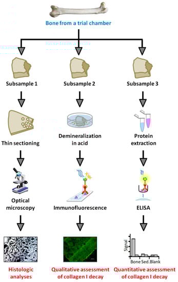 After completion of the experiment, the contents of each trial chamber were removed and the bones photographed. We then described their general state of decay and, with separate, sterile, disposable scalpels, divided the shaft of each femur into three sections for (1) resin embedding and histologic sectioning; (2) protein extraction; and (3) demineralization and immunofluorescence (Figure 4). This splicing revealed that white/gray-colored degradation products of medullary tissue remained within the shaft of each femur. These tissues, which were amorphous and generally consistent with the gelatinous nature of intensely decayed bone marrow (cf. [81]), were manually removed with sterile dissection probes prior to further examinations. Pliable, partially-decomposed periosteal linings were also immediately removed from each diaphyseal segment using separate, sterile disposable scalpels. Finalized diaphyseal samples designated for histology and protein extraction were then stored at −20 °C until further use, whereas those designated for immunofluorescence were demineralized in freshly-prepared 0.5 M ethylenediaminetetraacetic acid (EDTA) pH 8.0 (0.22 μm filtered) in new, autoclave-sterilized 20 mL glass scintillation vials for 2 weeks (with EDTA exchanged daily).