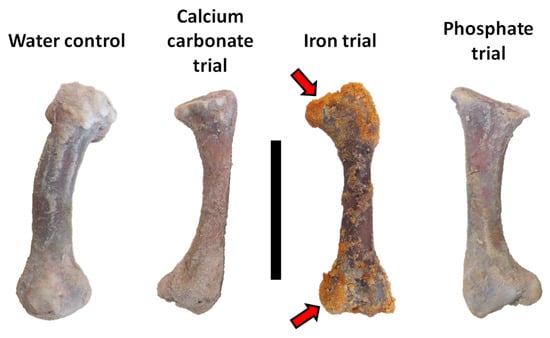 Chicken femora from each actualistic trial after completion of the experiment. Proximal ends are at top. Note sand adhered by an iron-oxide cement to the epiphyseal ends of the femur from the iron trial (red arrows). Scale bar equals 5 cm.