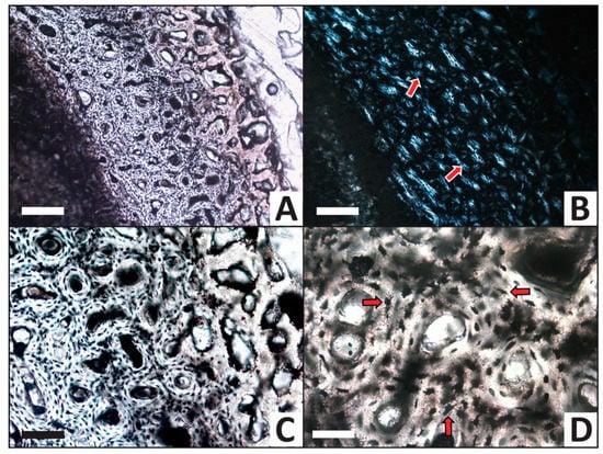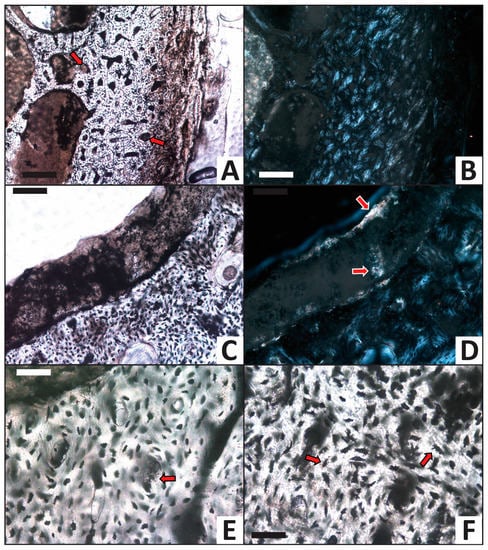 The femur from the phosphate trial appears essentially unaltered in histological structure (Figure 8A,B). Haversian canals frequently remain open (Figure 8C), hydroxyapatite crystal orientations are preserved (i.e., Maltese crosses are very common under crossed polars; Figure 8B), and osteocytes remain present throughout the entire section. As in the calcium carbonate trial (see above), osteocytes appear dark red-brown in color and retain clearly-visible, long filopodia (Figure 8D).