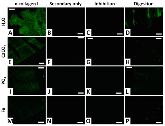 In situ immunofluorescence results showing the localization of collagen I in demineralized cortical fragments of chicken femora from each trial, alongside three different types of negative controls. All images show FITC-labeled antibody-antigen complexes under fluorescent light. (A–D) Water control trial. (E–H) Calcium carbonate trial. (I–L) Phosphate trial. (M–P) Iron trial. The first column (A,E,I,M) shows chicken femur tissue sections incubated with anti-chicken collagen I antibodies. The second column (B,F,J,N) shows secondary-only control sections that were not exposed to primary antibodies, to control for non-specific binding of secondary antibodies. The third column (C,G,K,O) shows sections exposed to anti-chicken collagen I antibodies that were first inhibited with chicken collagen (prior to incubation). The fourth column (D,H,L,P) shows sections digested with collagenase for 1 h prior to exposure to anti-collagen I antibodies. All section images were taken at 40X and 50 ms integration. All scale bars equal 50 μm.