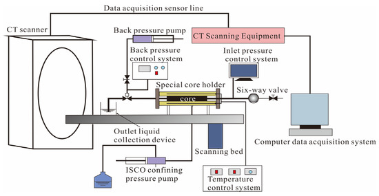The X-CT scanning experiment was carried out using a self-developed core online CT scanning system (Figure 2). The X-CT device was the Xradia-200 Micro-CT at the Core Laboratories of the EOR (enhanced oil recovery) Department of the Institute of Petroleum Exploration and Development of China. The scanning voltage was 120 keV, the current was 130 μA, and the spatial resolution was 0.5–35 μm. The CT image analysis software (CCTAS 2.0) was used for the data processing. In addition, a special core holder with a shell made of polyether ether ketone (PEEK) material was used to hold the core in position, and the X-rays could penetrate the core and reduce the scanning error caused by the ray hardening effect. Additionally, the apparatus used for the QEMSCAN test was the QEMSCAN ® 650F.