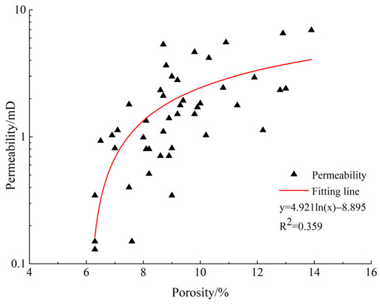 The porosity and permeability test results of the samples in the study area are shown in Figure 3. The samples were characteristic of poor reservoir quality, with the porosity and permeability of the samples being 6.3%–13.9% (avg. of 9.37%) and 0.131–6.930 mD (avg. of 1.97 mD), respectively, which belongs to the typical low porosity–low permeability-type tight reservoir. The correlation between porosity and permeability is weak, there is no obvious linear relationship between them, and the R2 is only 0.359. Samples with similar porosity exhibit different permeability; this may be attributed to differences in the microscopic pore structure. On the other hand, some samples developed microfractures with permeabilities up to 38.614 mD, indicating that fractures can improve reservoir permeability, but fractures have little effect on sample porosity. Moreover, due to the action of lithofacies and weathering leaching, the pore throat assemblages in this area are diverse, and the permeability variation coefficient is above 0.5, indicating that the reservoir heterogeneity is strong.