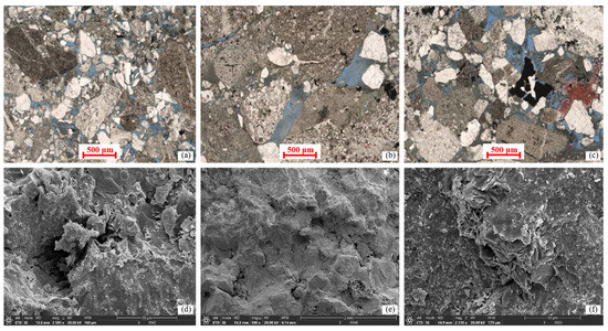 Furthermore, due to the strong heterogeneity of the distribution of minerals such as rigid minerals and chlorite films in the reservoir, their effects on pores are different. It can be observed that some complex storage and migration spaces such as the intragranular dissolved pores and cement micropores in the core were not strongly compacted during the formation process (Figure 17b,c), and as a result, the micron-scale mineral particles are loosely cemented and water-sensitive clay minerals are distributed in the fractures. It can be deduced that under the action of water flooding, these mineral particles would dissolve or slip, and the contact relationship and arrangement of the mineral particles would change, easily blocking the nano-micron-scale pore throats [34,35]. Therefore, this water-sensitive phenomenon reduces the permeability of the core, and the argillaceous cemented minerals in the core mainly exhibit plastic deformation, which is difficult to effectively recover from.
