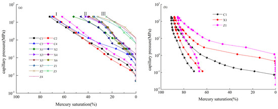 Capillary pressure curves of CSMI (a) and HPMI (b).