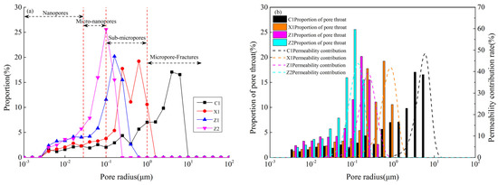 The pore throat distribution (a) and permeability contributions (b) of different types of samples.