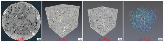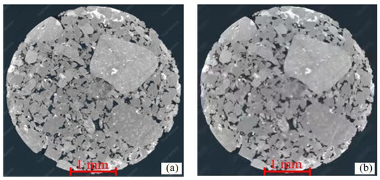 Furthermore, the CT grayscale images were imported into the AVIZO 8.0 3D visualization software, and human–computer interaction threshold segmentation was carried out to better distinguish between the rock skeleton and pores. Due to the tight lithology of the sample, the core was composed of pores and a tight matrix. A 3D reconstructed pore structure of the sample that was consistent with the actual core was obtained by segmenting the pore and matrix. The determination of the threshold was based on the measured porosity of the core and naked eye observations. Taking sample C1 as an example, the images before segmentation are shown in Figure 11a. First, the porosity of the core was measured using a porosimeter, and the porosity of the sample was 7.1%. Second, the image was segmented using thresholds of different sizes, and the core pore segmentation results corresponding to the different thresholds were observed via the human–computer interaction system. Through multiple segmentation adjustments, it was determined that when the threshold value was moderate, the segmented porosity was consistent with the measured porosity, and a binarized CT image could be obtained (Figure 11b).