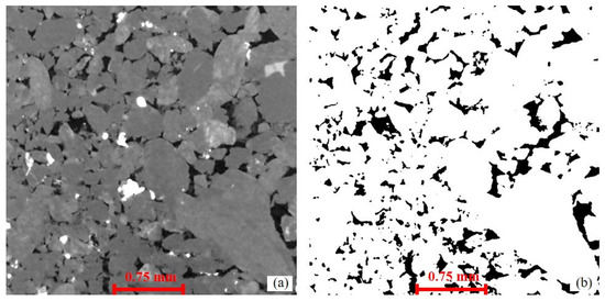 Human–computer interaction threshold segmentation. (a) The original 2D grayscale image; (b) Binary segmentation results (Black represents pores, and white represents rock matrix).