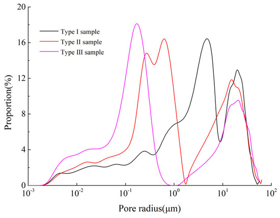 Moreover, the main pore throats contributing to seepage of the three types of samples are 0.63–6.31 μm, 0.25–1.13 μm, and 0.12–0.56 μm, respectively, indicating that the main contribution to permeability was made by the submicron-micron pores (Figure 7b). Although the distribution of the proportion of small-scale pore throats is much higher than that of large-scale pore throats, the permeability of the tight glutenite reservoir is mainly contributed to by the large-scale pore throats. In addition, it should be noted that information about some of the relatively large pores is missing from the HPMI, which may be attributed to the shielding effect.