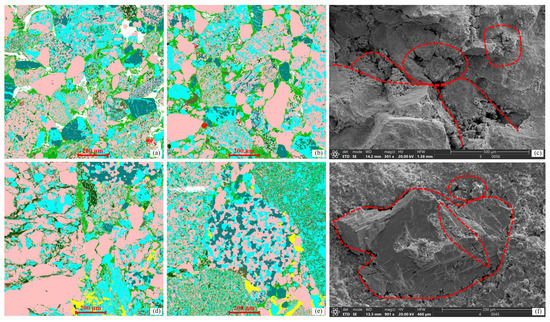 Mineral distribution characteristics and microscopic pore throat heterogeneity of different types of samples. (a) Type I samples C1; (b) Type II samples X1; (c) Type I samples C1; (d) Type III samples Z1; (e,f) Type III samples Z2. Notice that the red dashed line represents the large-scale intergranular/intragranular pores and microfractures are widely developed.