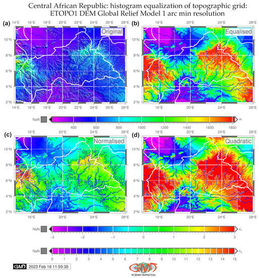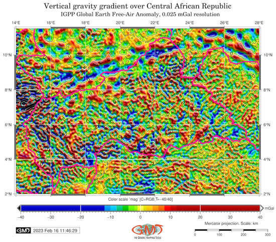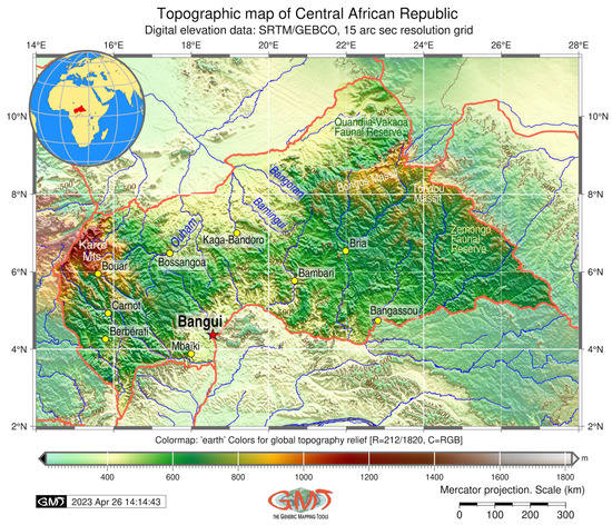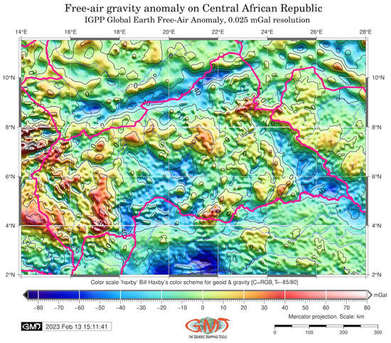 Lemenkova, P.; Debeir, O. Coherence of Bangui Magnetic Anomaly with Topographic and Gravity Contrasts across Central African Republic. Minerals 2023, 13, 604. https://doi.org/10.3390/min13050604