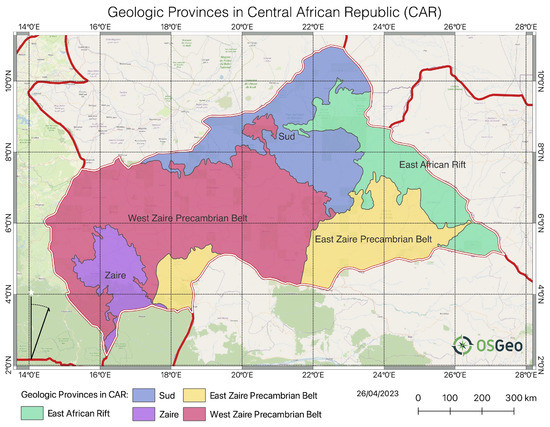 - Mestraud, J.L.; Bouvier, P.; Dongala, M.; Touveron, G. Carte Géologique de la Républiquc Centrafricaine à l’Échelle du 1:1,500,000; Bureau de Recherches Géologiques et Minières (BRGM): Paris, France, 1964. [Google Scholar]