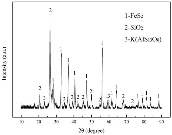 In this study, the gold cyanide residue produced by a gold enterprise in Shandong province (China) was used. The XRD analysis of the gold cyanide residue shown in Figure 1 reveals that the main minerals were quartz and pyrite, indicating that Si, S and Fe were the main elements combining with chemical analysis (Table 1). Table 2 shows the cyanide contents in the cyanide residue and toxic leaching solution. The content of total cyanide was much higher than free cyanide, showing that there were plenty of stable metal complex cyanides. The moisture content of the cyanide residue was about 15%. Over 90% of mineral particles in the cyanide residue were smaller than 40 μm.