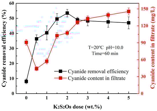In this section, the K2S2O8 dose was varied in the range 0.5~5.0 wt.% under the following conditions: pH = 10.0, T = 20 °C and time = 60 min. The results are shown in Figure 4. The cyanide removal efficiency increased with increasing K2S2O8 addition from 0.5 wt.% to 2.0 wt.%. The K2S2O8 dose of 2.0 wt.% was over three times that of the theoretical amount calculated using Equation (3), suggesting that part of the excess persulfate reacted with pyrite in the cyanide residue. Persulfate was also considered as a kind of radical scavenger (Equations (4) and (5)); the higher dose of persulfate resulted in weak oxidability, and as shown in Figure 4, the efficiency decreased with the K2S2O8 dose over 2.0 wt.%. On the other hand, the content of cyanide in the filtrate increased when the K2S2O8 addition was over 0.5 wt.%. S2O82− with high concentration began to oxidize pyrite, with the result that the free cyanides generated through the decomposition of complex cyanides could not be removed effectively. These cyanides could be absorbed into the residue by the surface of the cyanide residue or remain in the filtrate, leading to the increase in cyanide content in both residue and filtrate. In practical production, filtrate with a high content of cyanide could be recovered and returned to the cyanidation process for secondary utilization. Taken together, the K2S2O8 dose of 2.0 wt.% was best for the cyanide removal of gold cyanide residues.
