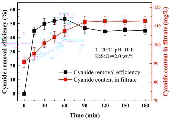 As one of the advanced oxidation processes, persulfate oxidation has the advantage of a rapid reaction. To investigate the reaction rate of cyanide removal through persulfate oxidation, the experiments were carried out with a reaction time of 15~180 min, under the conditions of pH = 10.0, T = 20 °C, K2S2O8 = 2.0 wt.%. The results are shown in Figure 5. It was demonstrated that cyanide removal efficiency increased significantly during the first 15 min and reached its highest at 60 min. It was speculated that the reaction essentially ended after 60 min, as not only were no new free radicals generated, but also the amount of free radical quenching increased, resulting in a decrease in cyanide removal efficiency. The cyanide content in the filtrate increased gradually until 90 min. It was also found that there was, respectively, 1.43 g/L, 2.54 g/L, 2.03 g/L and 1.94 g/L Fe3+ in the filtrate at the reaction time of 30, 60, 90 and 120 min. When the content of Fe3+ and cyanide in slurry reached a certain level, Fe4[Fe(CN)6]3 precipitation formed and entered into the residue, decreasing the content of Fe3+ in the liquid phase and the cyanide removal efficiency of the residue after 60 min. According to the results in Figure 5, the time of the cyanide removal process should be set at 60 min.