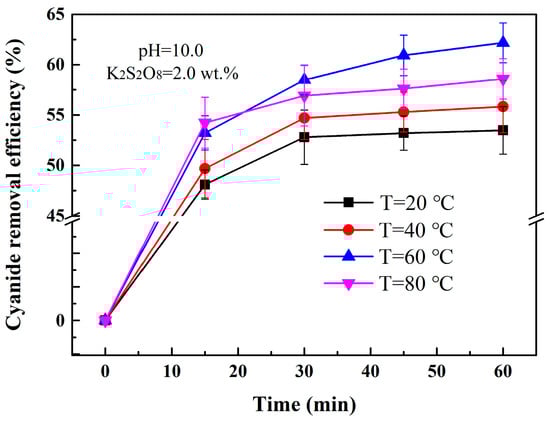 In this section, cyanide removal was studied under different temperatures (20 °C to 80 °C) and under conditions of pH = 10.0, K2S2O8 = 2.0 wt.% and time = 60 min. It is shown in Figure 6 that 60 °C was the most efficient temperature, with 62.18% removal efficiency, indicating that the cyanide removal was promoted by heat activation. Two pathways were put forward to explain the generation of sulfate radicals () by heat-activated persulfate, as shown in Equations (6) and (7). The first is that one persulfate ion produces two sulfate radicals using heat energy, and the second is that an electron donor reacts with an ion, generating a single sulfate radical, like the pathway of metal-activated persulfate [32]. At present, lots of studies have shown that heat activation was more effective than metal activation, so the first pathway (Equation (6)) has been generally considered to be the pathway of heat activation [33,34]. In this way, 1 mol persulfate could generate 2 mol through fracturing O-O bond with a thermal activation energy of 140.02 kJ/mol [15]. The cyanide removal efficiency could be increased by a small increase in temperature.