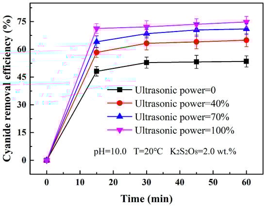 Ultrasonic activation refers to the production of active substances through the expansion and collapse of the cavities under the influence of sound field. The phenomenon is also called acoustic cavitation [37]. Ultrasound could improve the degradation of pollutants by promoting the generation of free radicals and mass transfer among reactants [38]. To investigate the effect of ultrasonic activation on the treatment of cyanide residue, cyanide removal experiments were carried out under the conditions of different ultrasonic power (0, 40%, 70% and 100%), T = 20 °C, initial pH = 10.0, K2S2O8 dose = 2.0 wt.% and time = 60 min. The results in Figure 7 show that the maximum cyanide removal efficiency reached 74.76% under the condition of ultrasonic power = 100%, which is 12.58% more than that of heat activation in Section 3.4. This indicates that the generation of free radicals for cyanide removal was promoted by the increasing number of collapsing bubbles during the ultrasonic activation process. The lowest cyanide content in the toxic leaching solution of the residue after the ultrasonic-activated persulfate-advanced oxidation process was 3.84 mg/L < 5 mg/L, meeting the national standard (HJ943-2018, China).